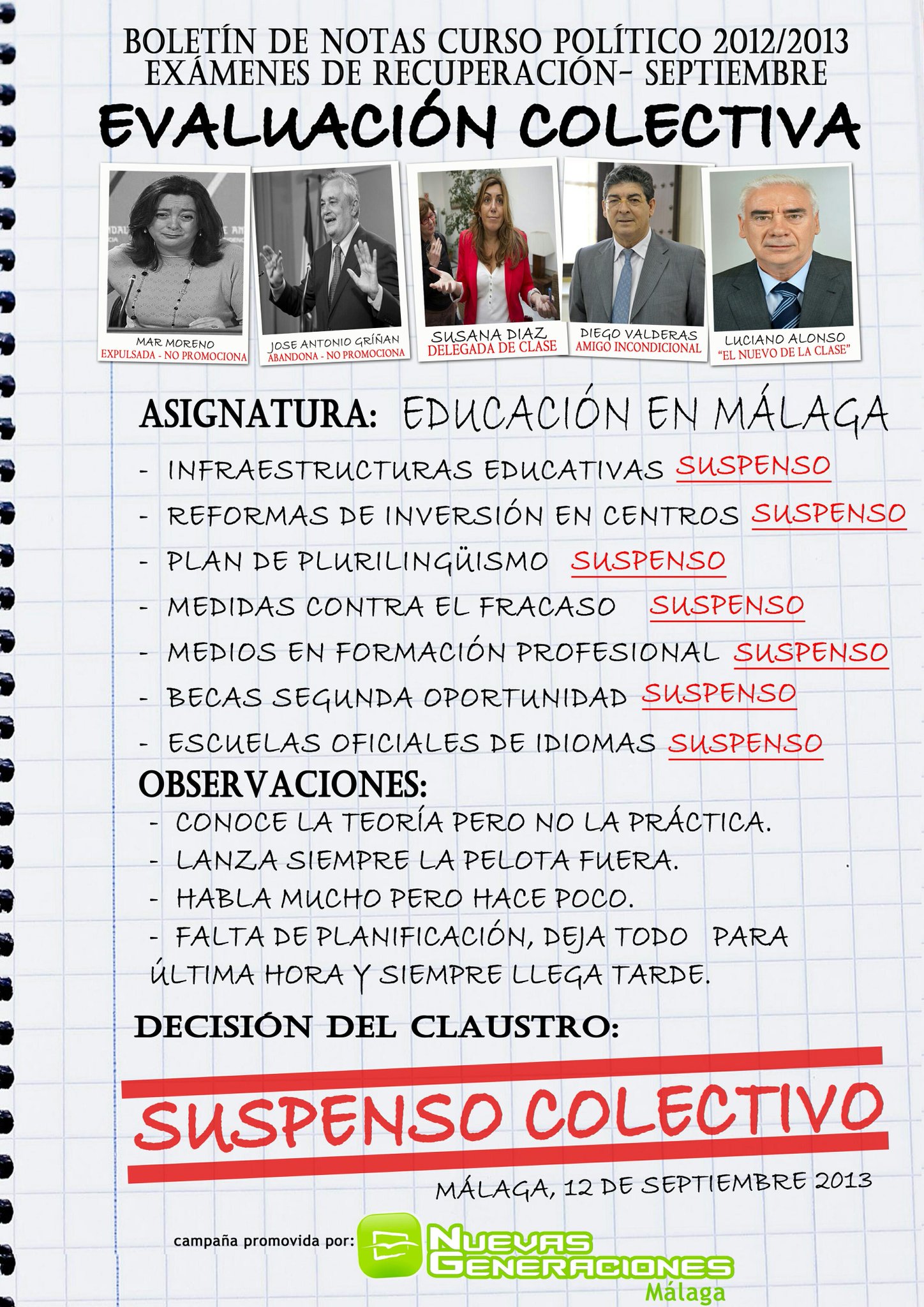 Verde, que ha comparecido junto al vicesecretario de Educación de NNGG de Andalucía, Enrique Rodríguez, ha denunciado este hecho en la presentación de un boletín de notas en el que han calificado con un suspenso la gestión educativa de la Junta en Málaga, respecto a lo cual ha anunciado que su formación remitirá al Gobierno andaluz un listado con las deficiencias educativas de la provincia para que el nuevo ejecutivo las aborde en los presupuestos andaluces de 2014, que están siendo elaborados en estas fechas.